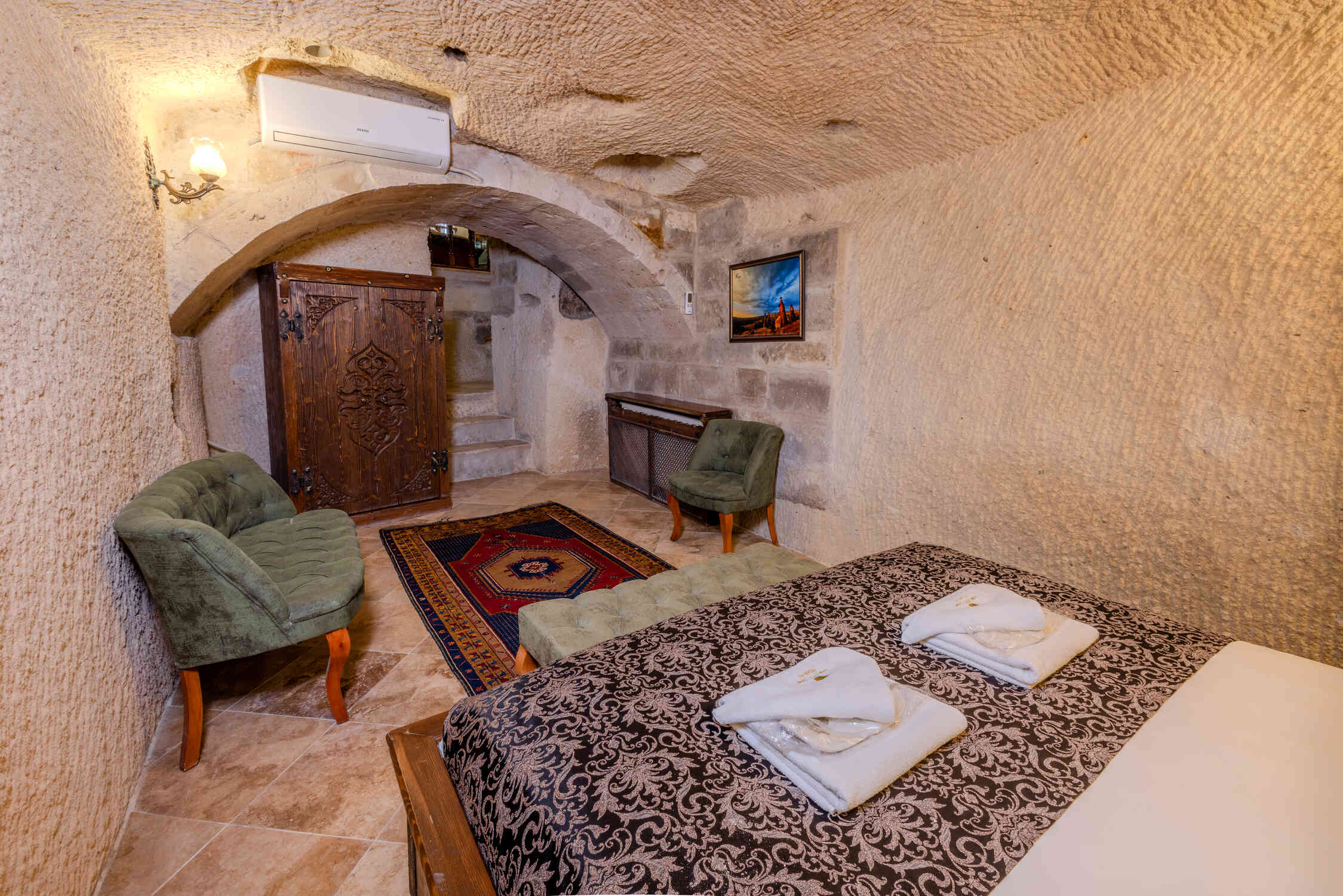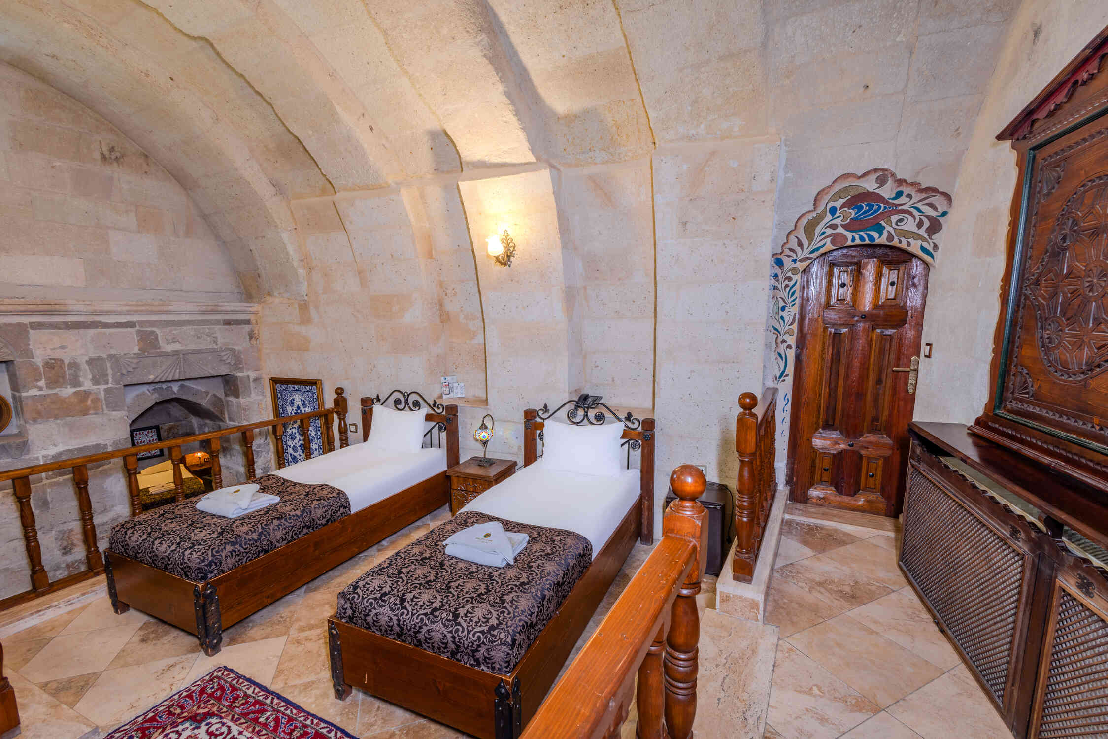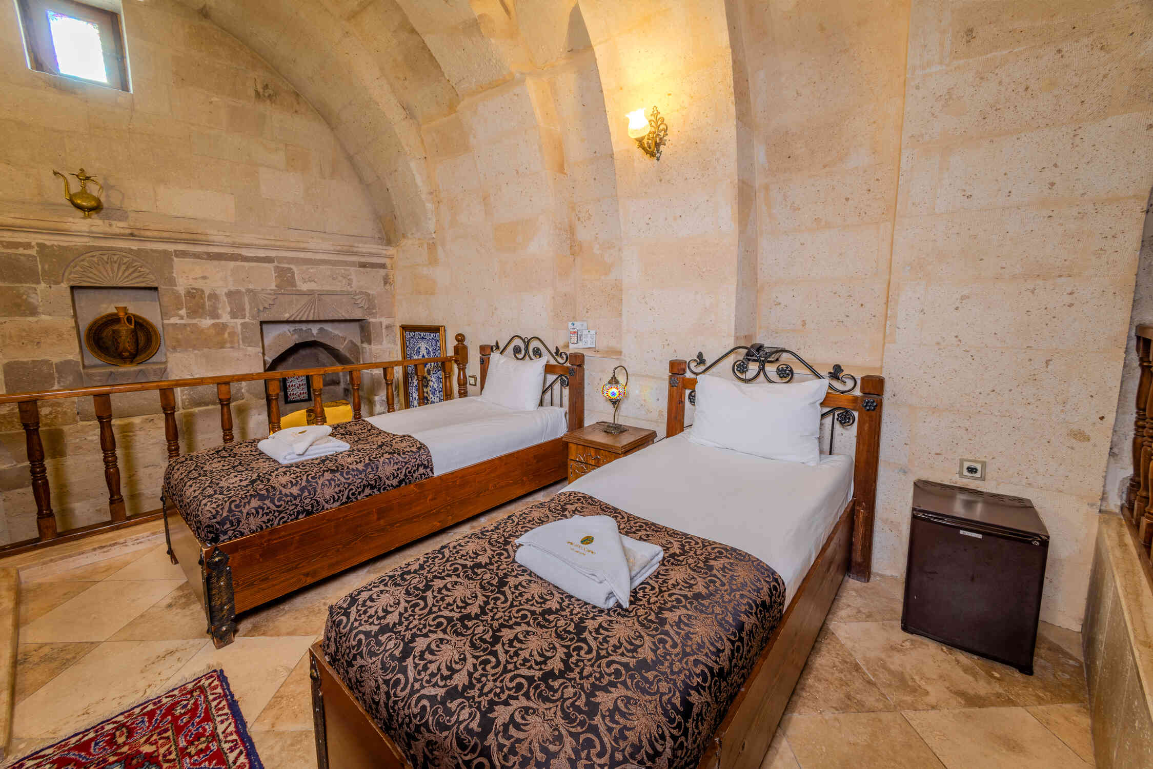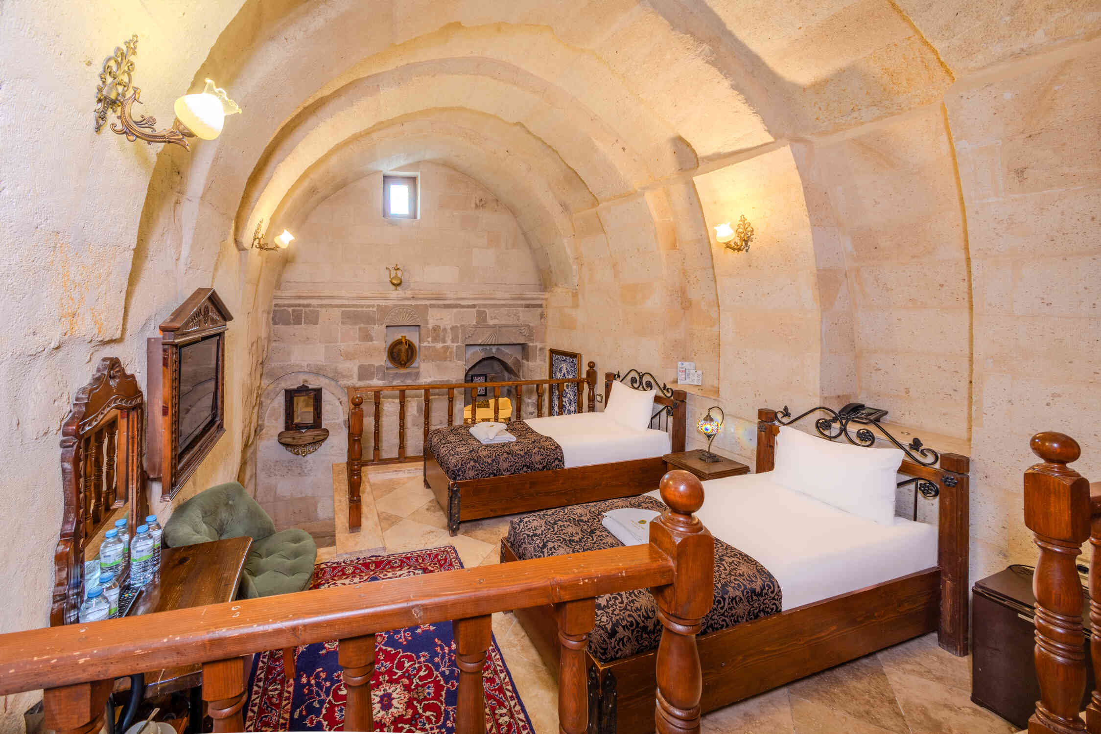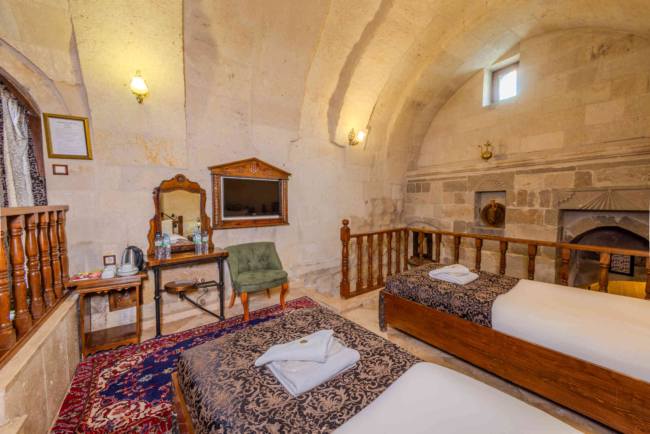 This spacious family suite offers a unique experience with a traditional stone room design. Perfect for families or groups, it includes one double bed and two single beds. The suite also features a luxurious jacuzzi, making it the ideal choice for relaxation in the heart of Cappadocia’s natural beauty.