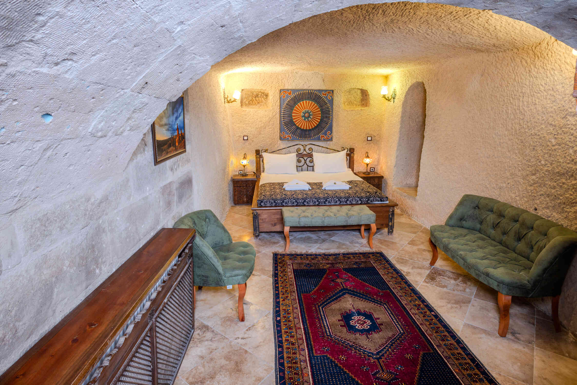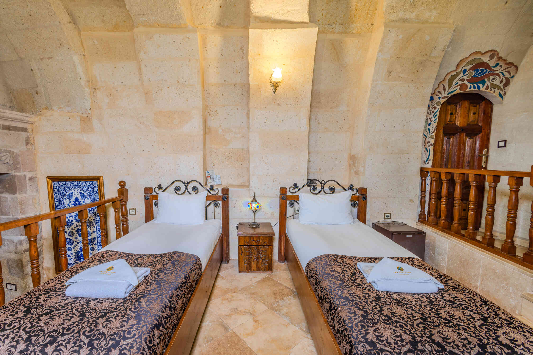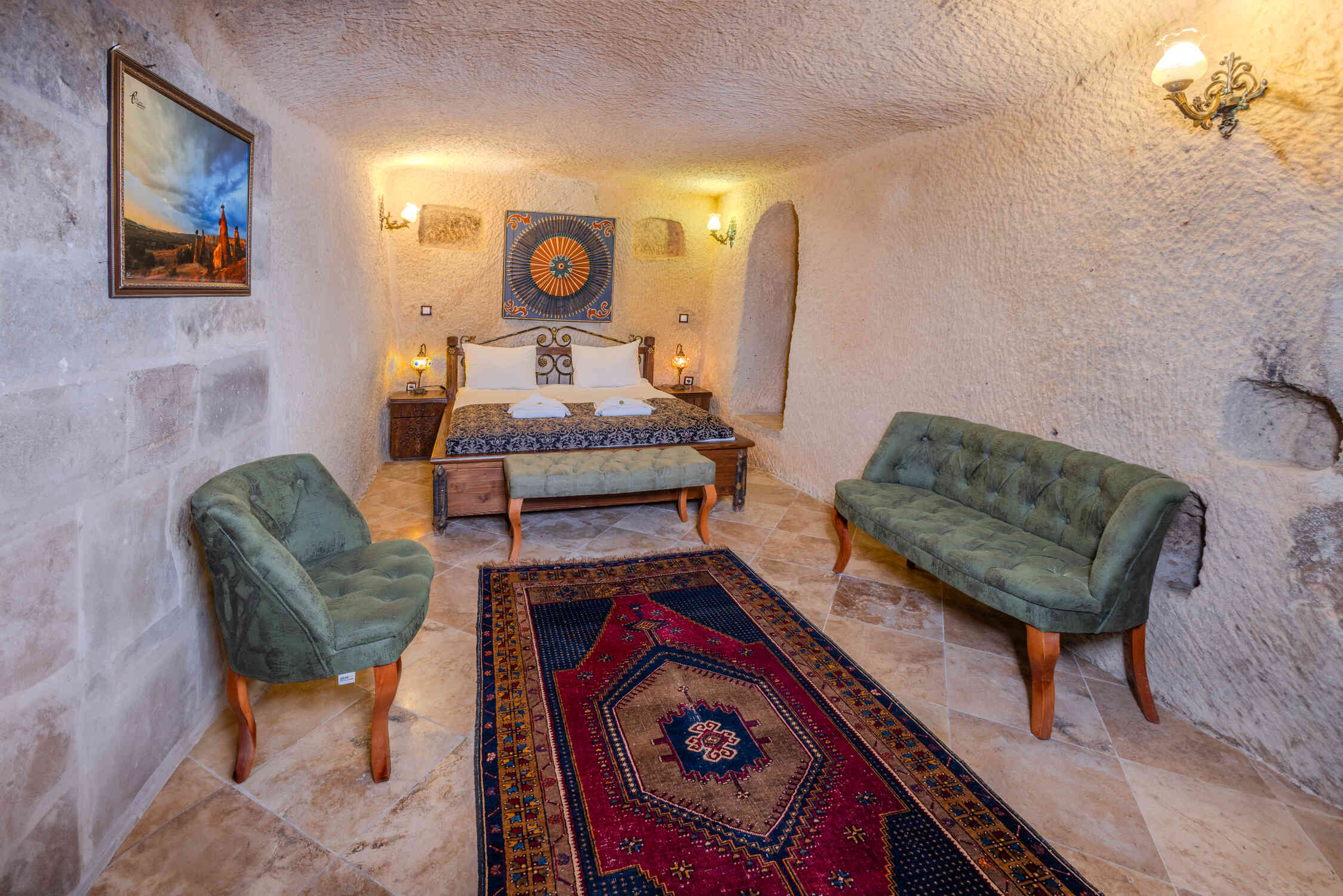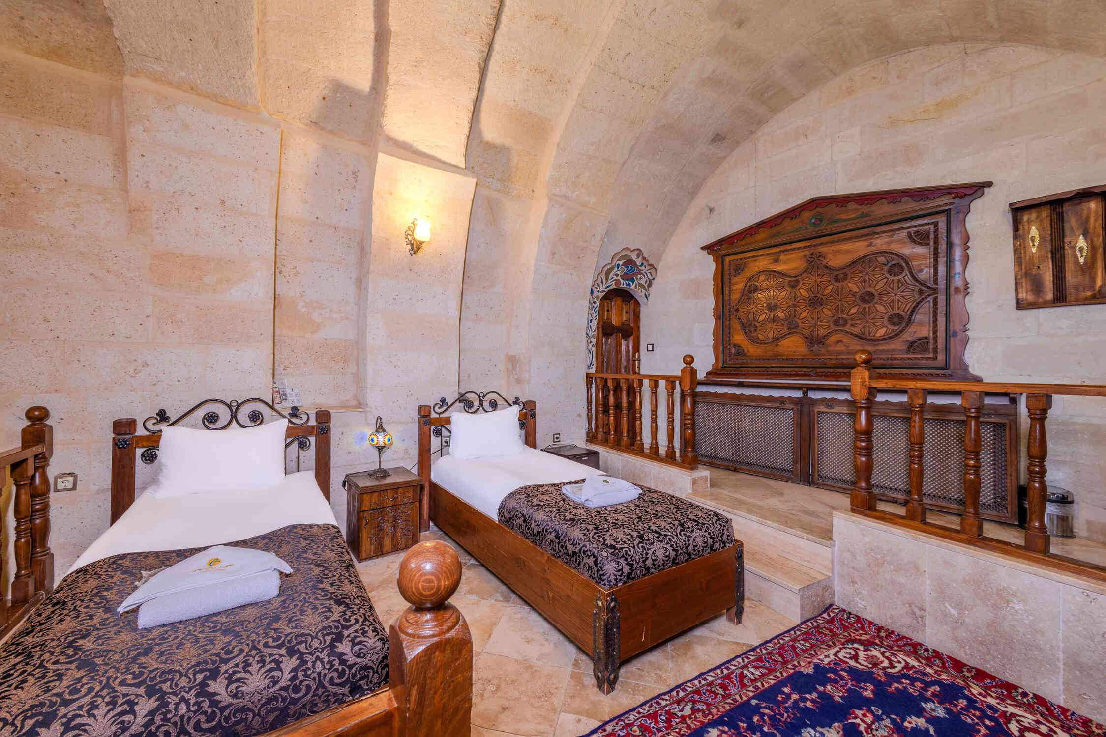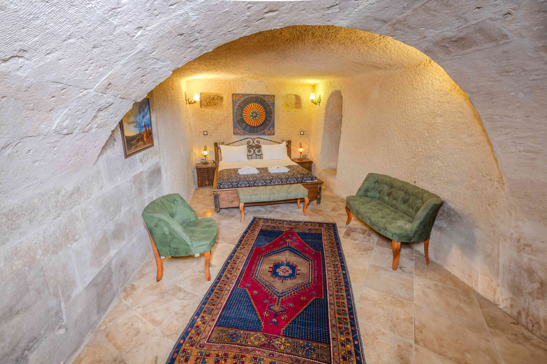 This spacious family suite offers a unique experience with a traditional stone room design. Perfect for families or groups, it includes one double bed and two single beds. The suite also features a luxurious jacuzzi, making it the ideal choice for relaxation in the heart of Cappadocia’s natural beauty.