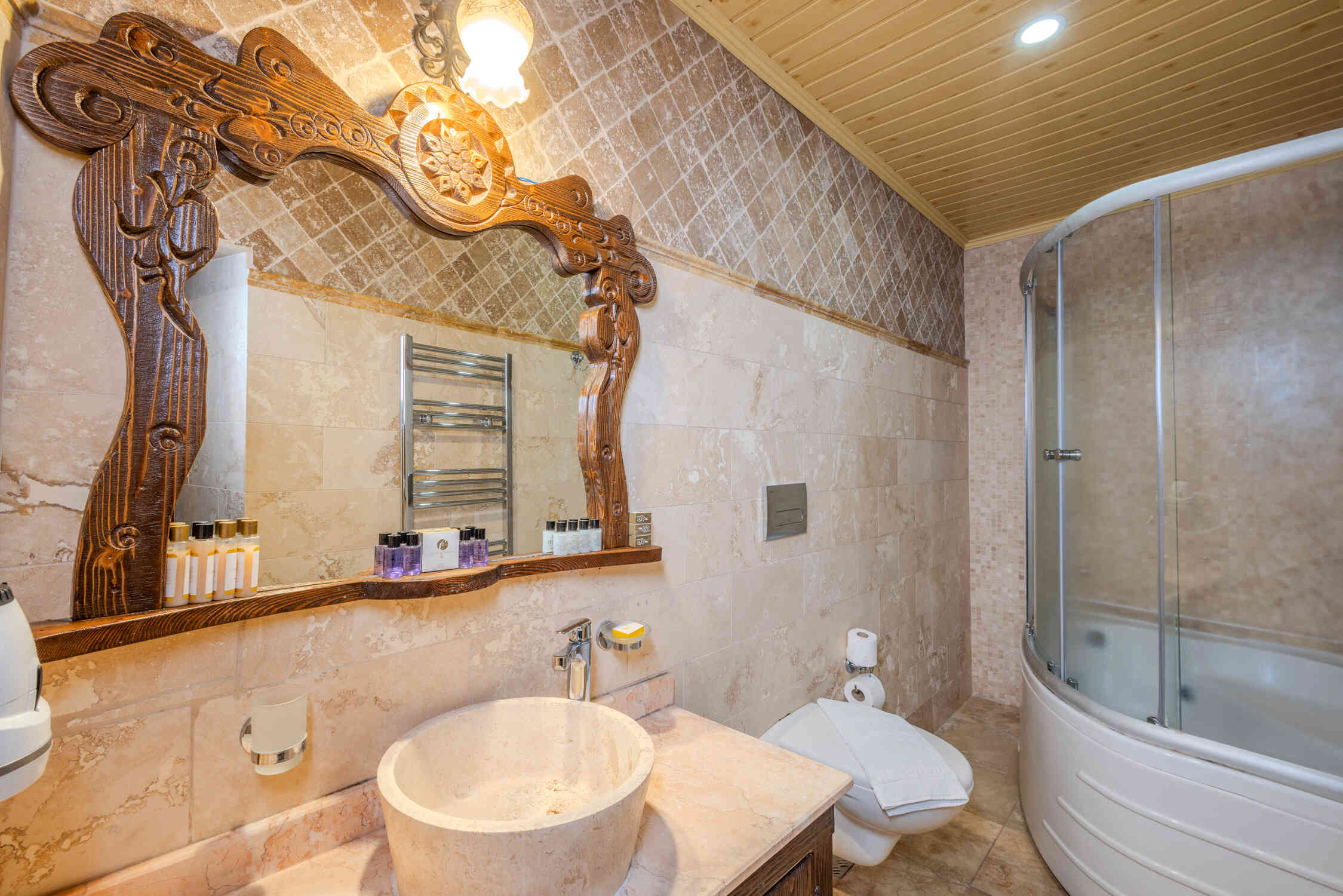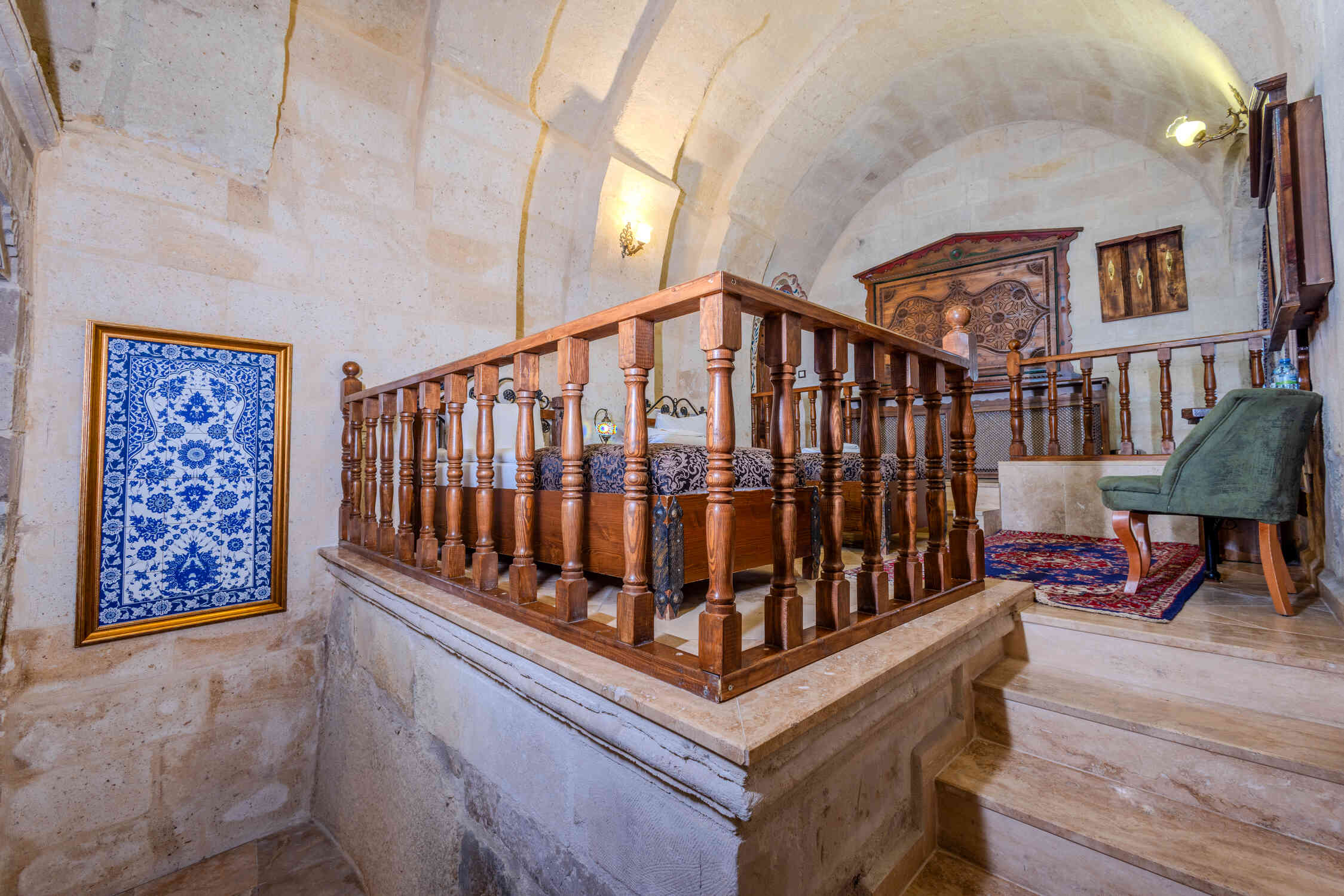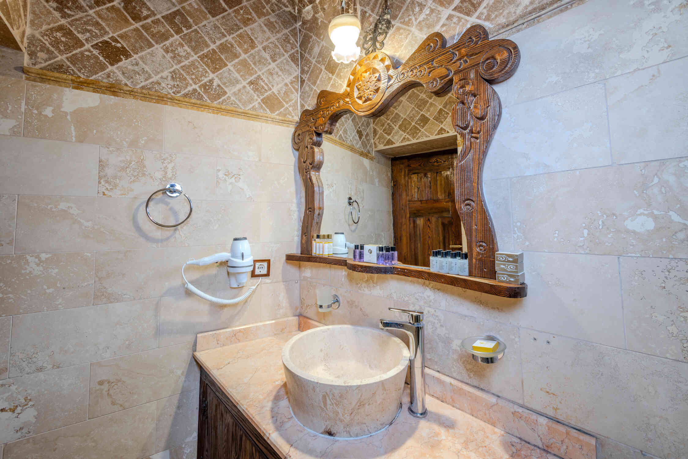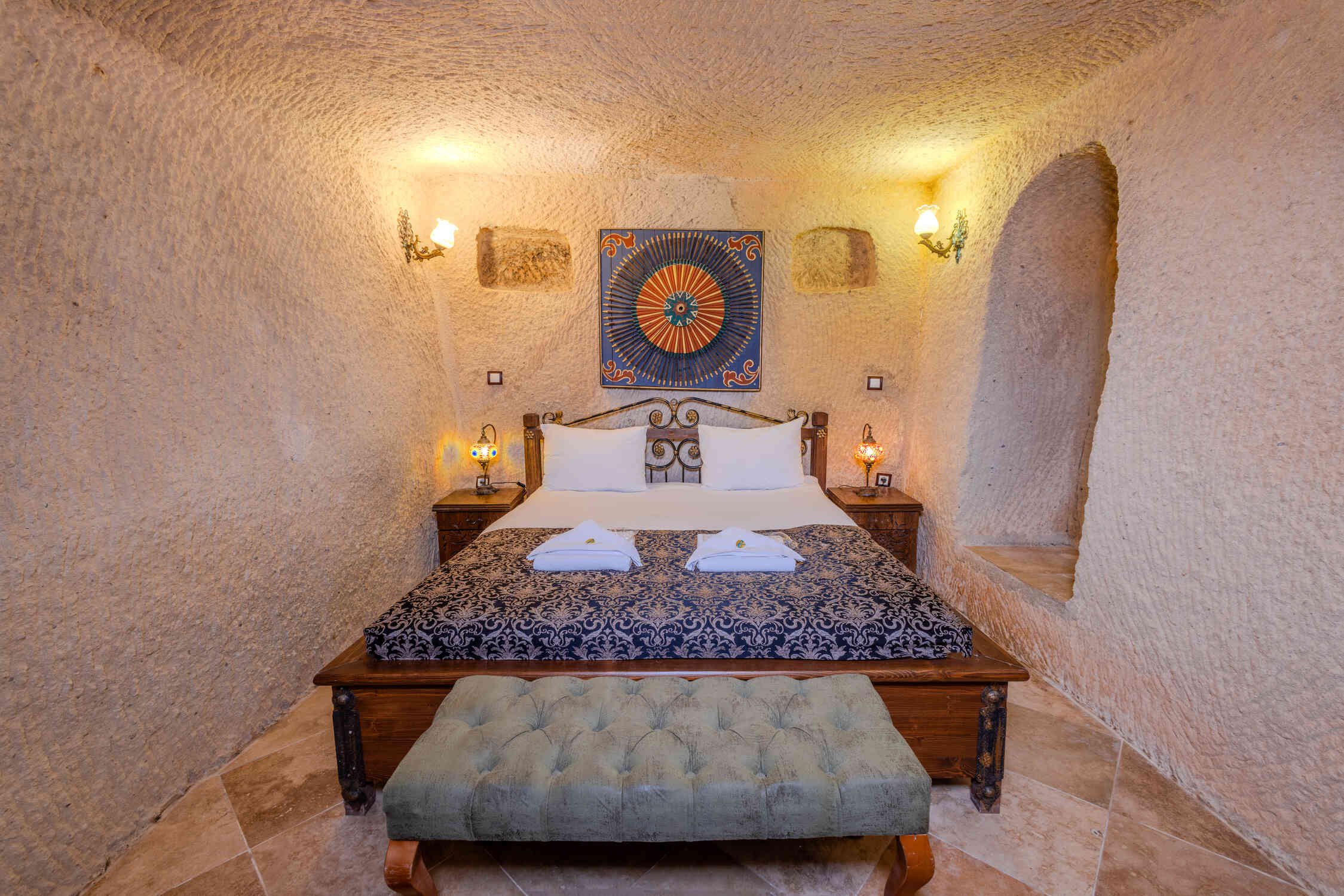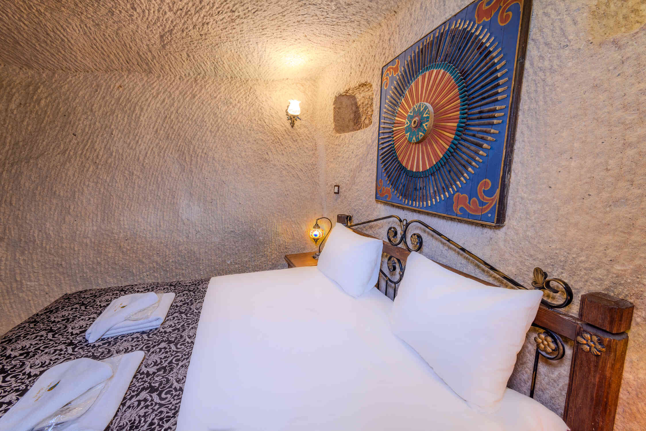 This spacious family suite offers a unique experience with a traditional stone room design. Perfect for families or groups, it includes one double bed and two single beds. The suite also features a luxurious jacuzzi, making it the ideal choice for relaxation in the heart of Cappadocia’s natural beauty.