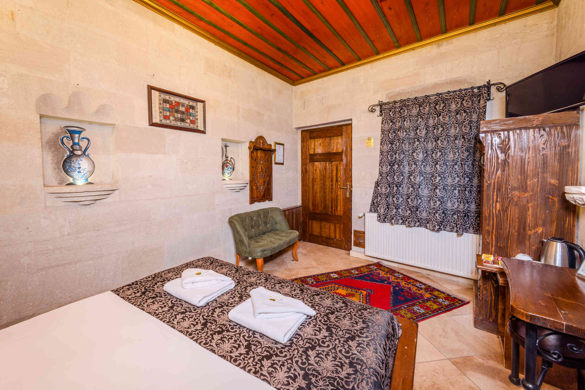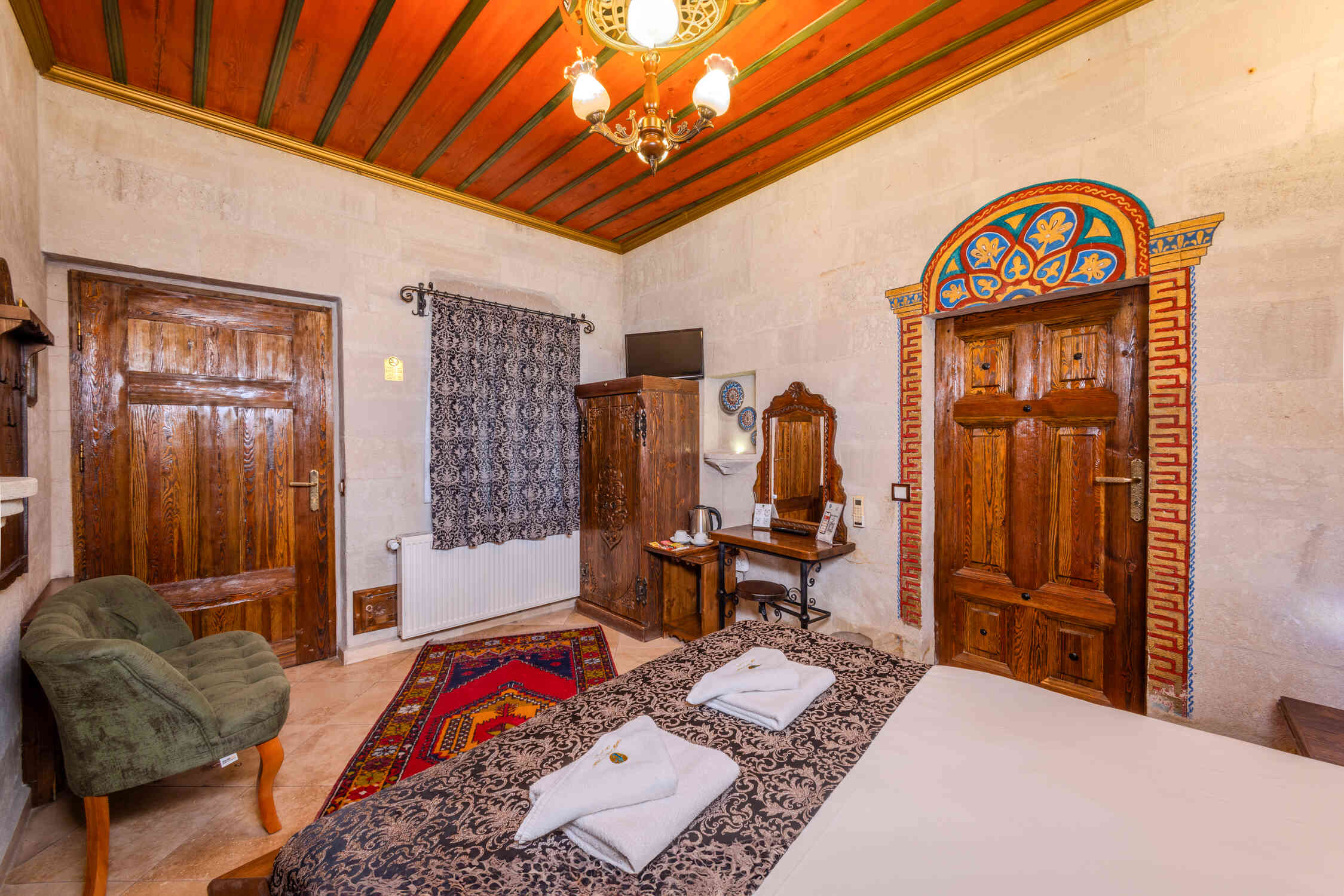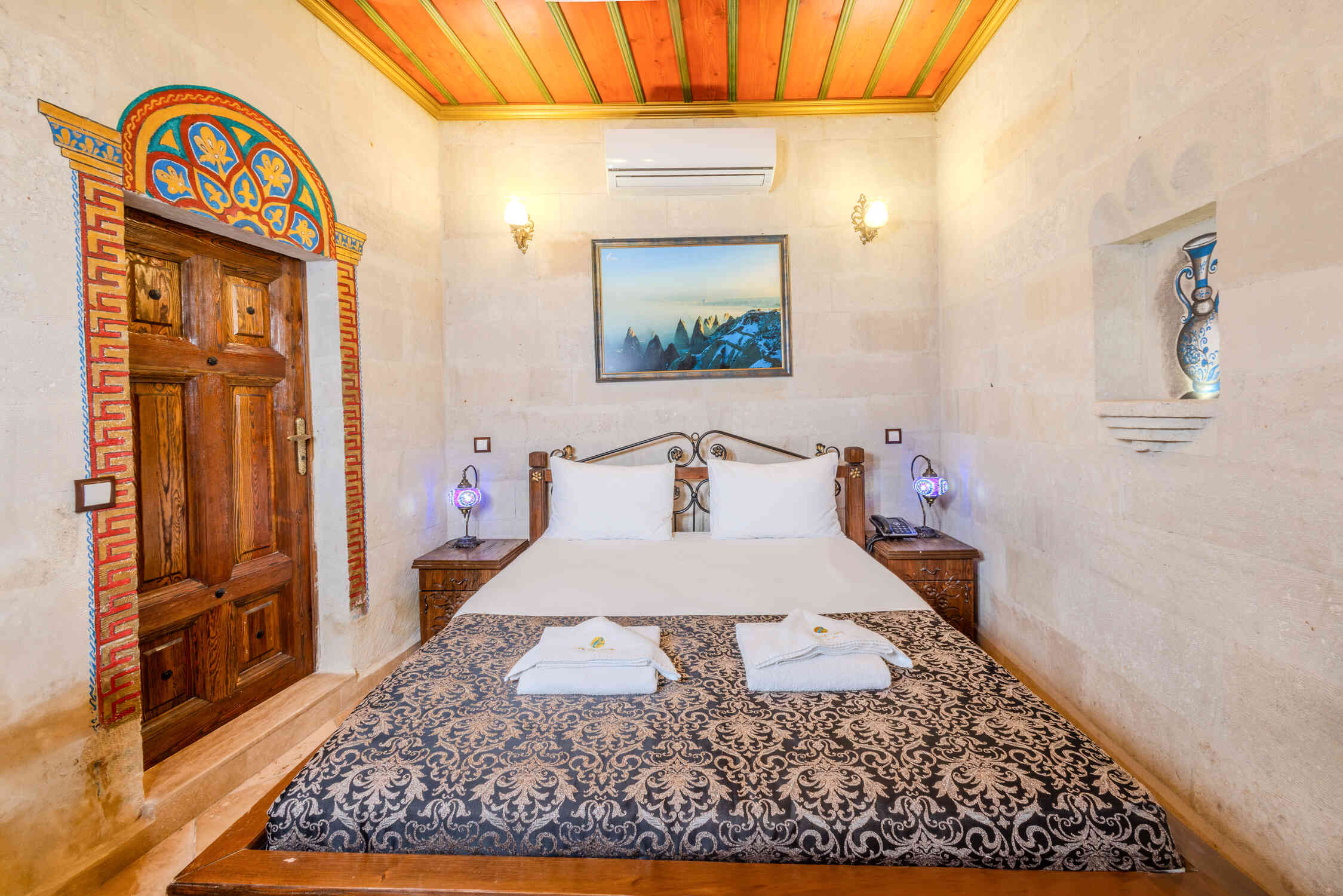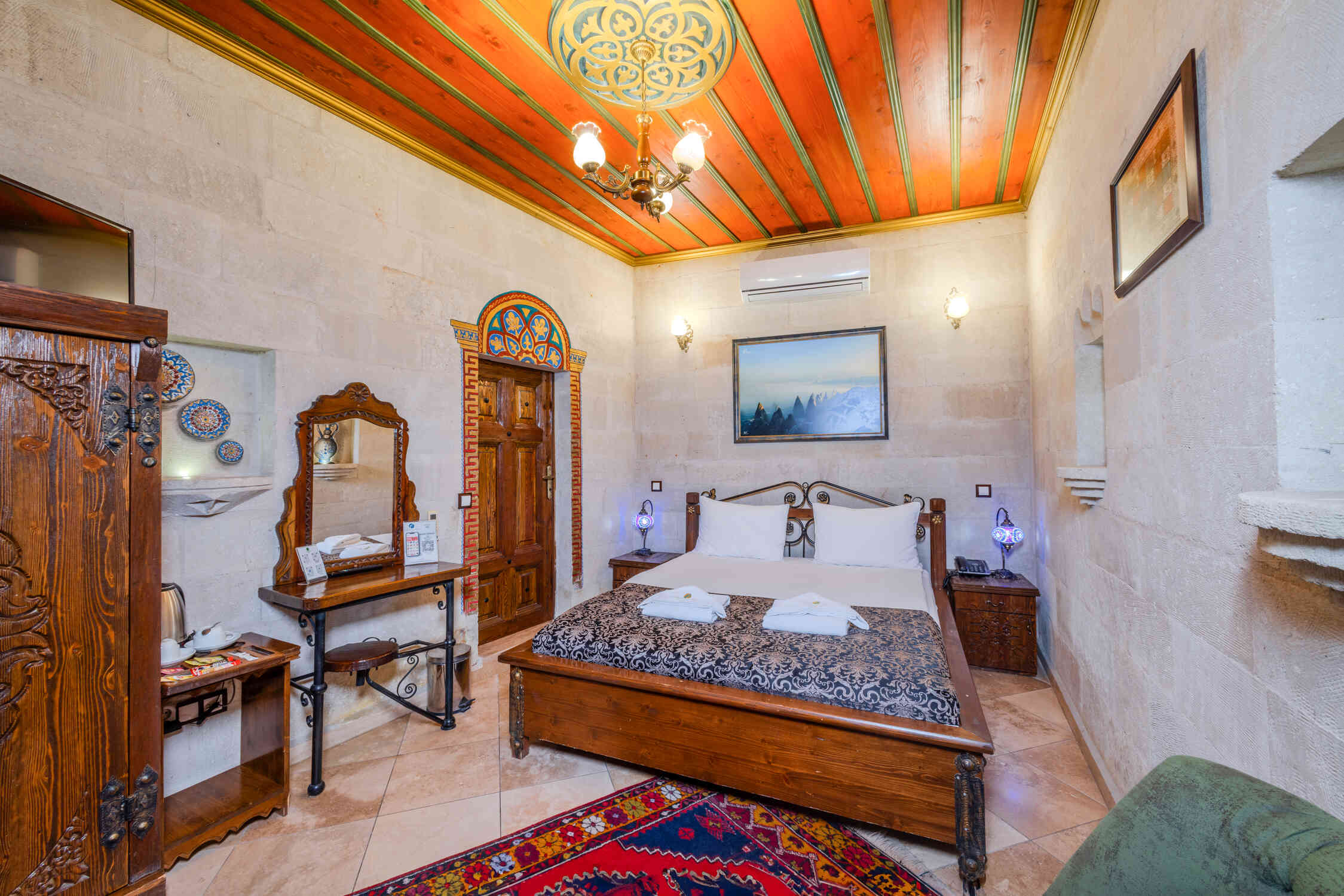A stylish and comfortable room perfect for couples, featuring a king-size bed. Relax and enjoy the peaceful ambiance of this deluxe room, offering modern amenities and a tranquil atmosphere in Cappadocia.